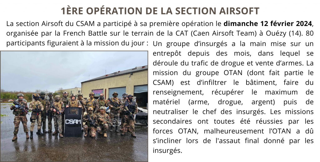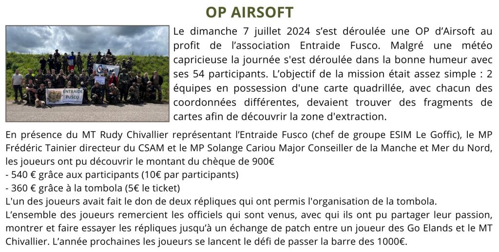 La section Airsoft du CSAM Cherbourg a organisé le dimanche 29 juin 2025 une « OP » au profit de l’association entraide Fusco, avec un défi lancé par les joueurs l’année dernière qui était de dépasser les 1000€. Cette année plusieurs petits scénarios ont été organisés, ce qui a permis aux participants de découvrir le terrain et différents mode de jeux.